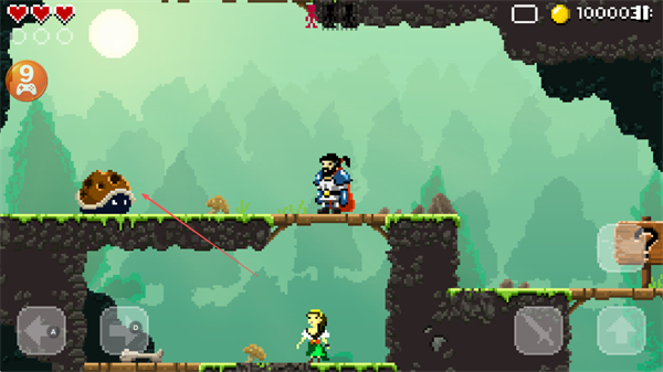 1、操控勇士在像素场景中,利用武器攻击蜗牛等敌人,探索带问号木牌区域,收集金币。