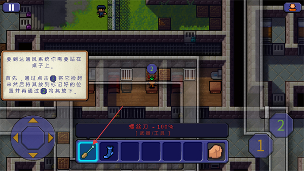 2、按提示捡起路障,放到标记位置,站在桌子上前往通风系统。