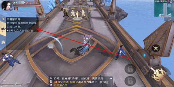 2、跟随主线指引移动到目标NPC处,与观礼众人完成交谈互动,推进当前剧情的流程。