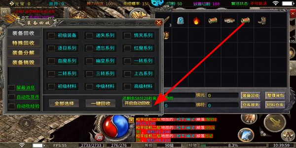 4、打开装备回收界面,选择对应的装备类型,点击一键回收处理闲置装备,获取相应资源。
