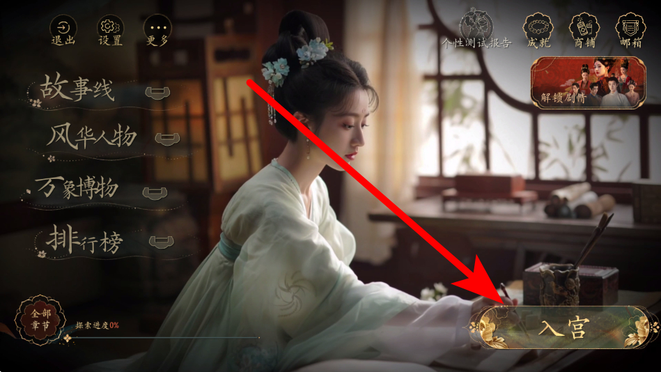 1、玩家首先开启入宫,在游戏界面中,点击入宫开始游戏按钮,开启宫廷探索的旅程,进入到宫廷的初始场景。