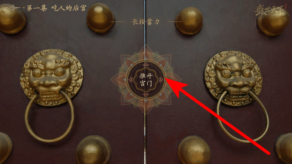 2、然后推开宫门,在面对宫门时,按照提示长按蓄力,完成推开宫门的操作,进入到宫门之后的宫廷区域。