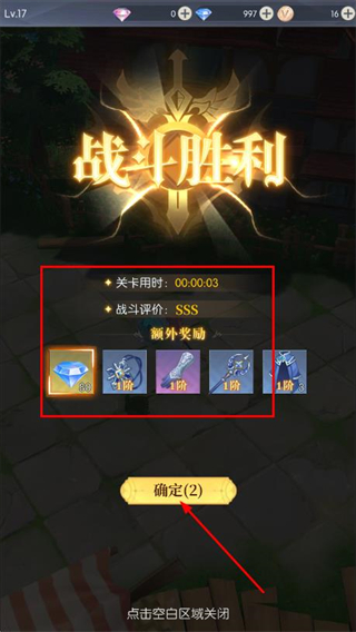 3、参与关卡战斗,胜利后领取钻石、装备等额外奖励,点击确定关闭结算界面。