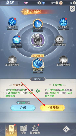 4、点击底部技能按钮进入技能页,点击一键升级提升已解锁技能等级,增强战斗能力。