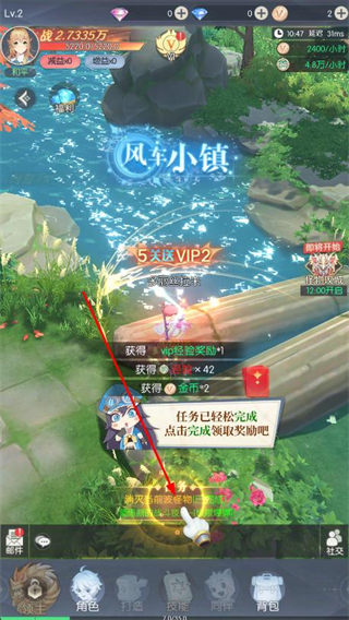 1、打开云上大陆,在主界面点击任务提示完成主线任务,领取经验、金币等奖励。