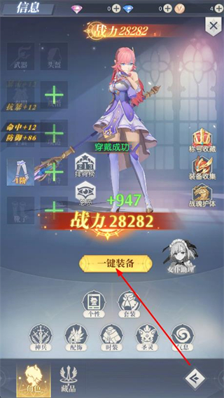 2、点击底部角色按钮进入角色页,点击一键装备自动穿戴最优装备,提升战力。