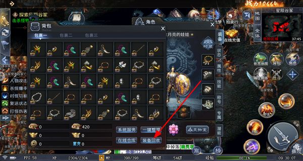 4、打开背包界面,可查看已获得的装备,点击一键整理能规整背包物品,也可通过装备回收处理不需要的装备。