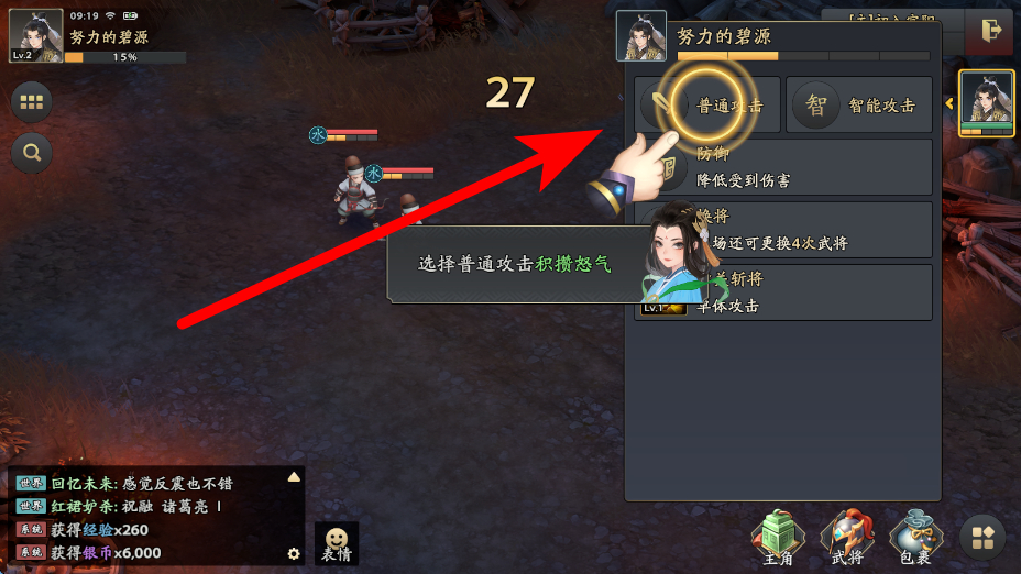 3、在战斗过程中,可选择普通攻击,通过普通攻击能积攒怒气,积攒一定怒气是释放必杀技的前提,需持续进行普通攻击来积累。