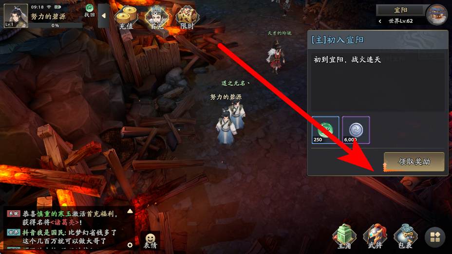 2、随后跟随主线任务指引,比如初入宜阳这类主线,完成任务后可点击领取奖励,获取经验、钱币等,助力角色成长与资源。