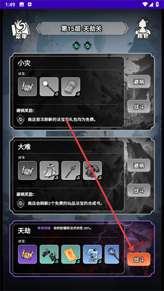 2、进入关卡后,选择避祸,进入最后一个关卡天劫,点击战斗。
