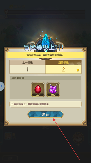 4、击败BOSS后,冒险等级会上升,获得红晶、紫晶等资源奖励,点击确认领取,用于后续强化和升级。