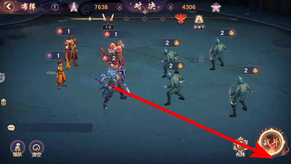 3、接着展开战斗,在对阵等场景下,完成布阵等准备工作后,点击战斗按钮,让角色与敌人展开交锋,运用策略与实力应对战斗。