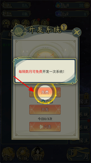 3、进入开发系统界面后,点击免费按钮,这是启动免费开发的关键操作,每隔数月可免费开发一次,获取系统提升实力。