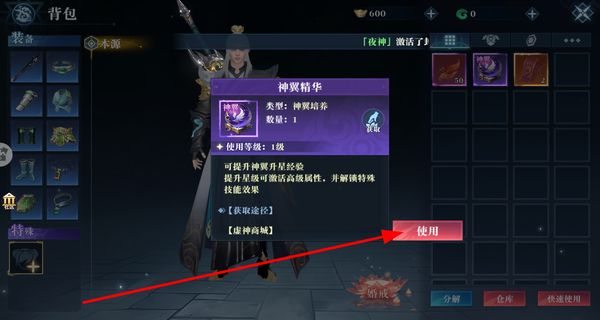 3、在背包中选择神翼精华等道具并使用,提升神翼星级,激活高级属性和特殊技能,增强角色能力。