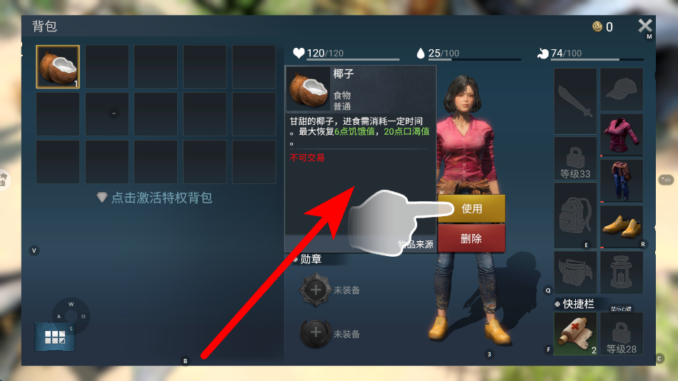 4、进入背包界面,当需要补充体力或满足其他需求时,选择相应的物品,如椰子,点击使用,发挥物品的作用,保障角色生存。