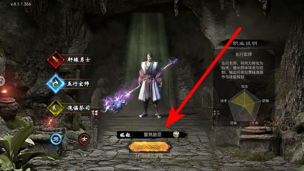 1、初始界面,有轩辕勇士、五行玄师、傀儡祭司等不同职业可供选择,每个职业都有其独特的特点,选好职业并设置好昵称后,点击进入游戏,开启冒险。