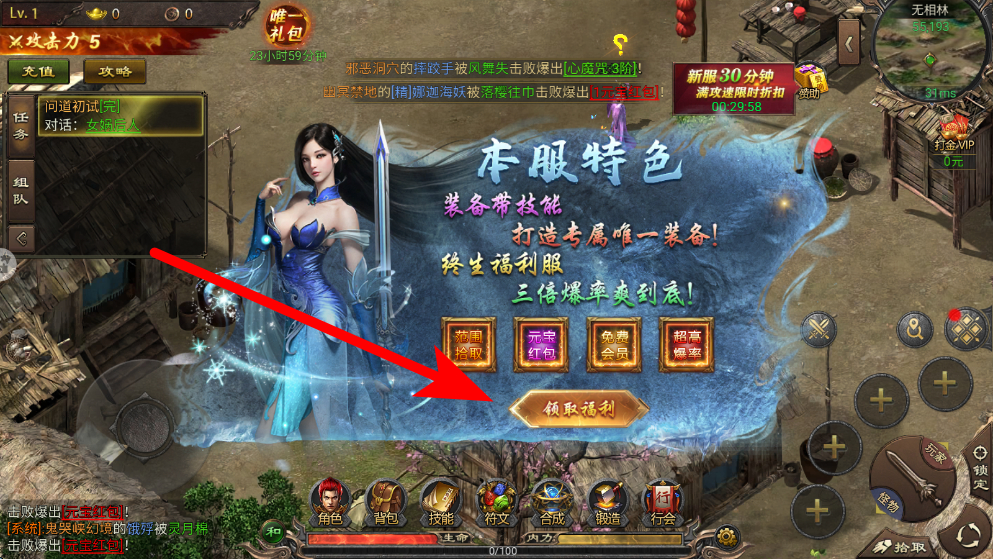 2、进入游戏后,会弹出本服特色相关的界面,展示装备带技能、打造专属唯一装备等福利内容,点击领取福利,可获取相应的福利,助力角色成长。