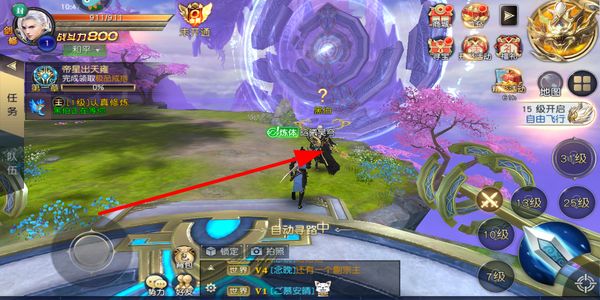 2、玩家在主界面开启自动寻路功能,跟随剧情任务指引移动到目标NPC处,推进主线剧情的流程。