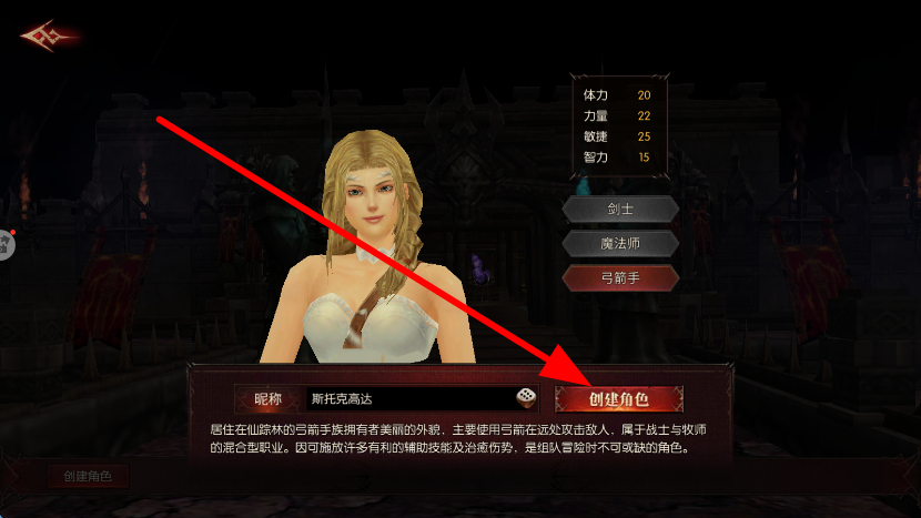 1、进入游戏后,角色创建界面挑选职业,如弓箭手等,设置昵称后点击创建角色,正式踏入奇幻世界,开启冒险征程。