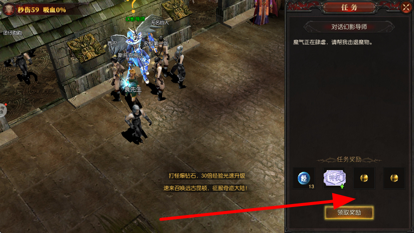 3、接取任务后,按照任务指引,如对话幻影导师后击退魔物,完成任务目标,随后点击领取奖励,获取经验、道具等奖励。