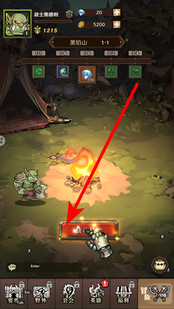 1、触发战斗在冒险界面选定闯关黑焰山关卡1,点击战斗开始按钮进入对战场景,此为获取资源与经验的基础入口,开启冒险征程第一步。