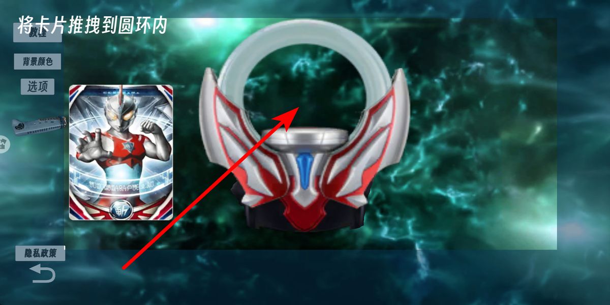 1、进入欧布的圆环界面,选中左侧奥特融合卡牌,长按卡片向圆环区域拖动,将卡牌推送至圆环内,完成变身前的卡牌加载步骤。