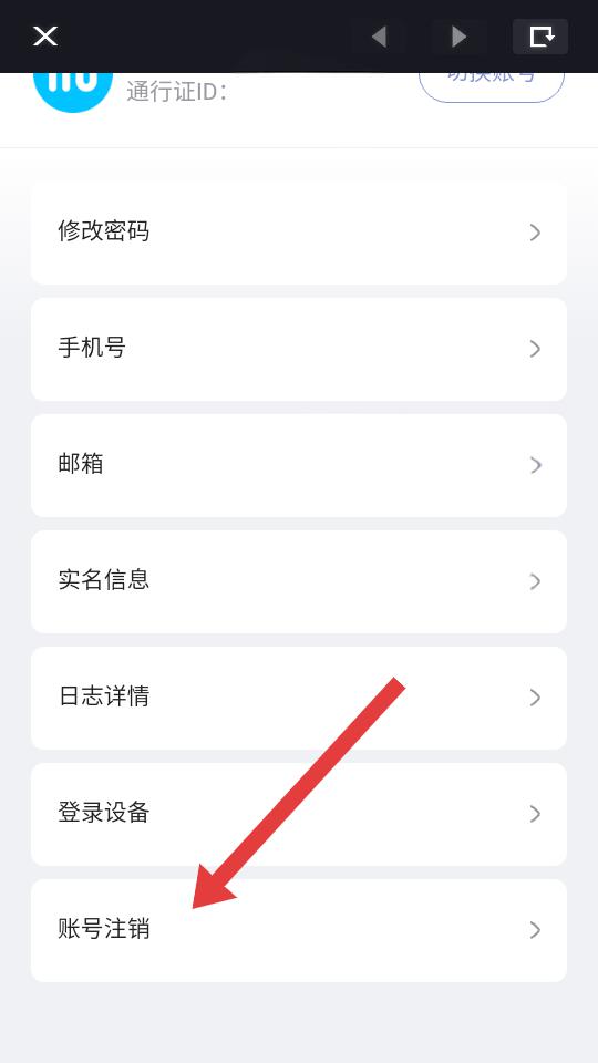 3、在通行证界面底部,点击账号注销选项,按提示选择注销原因、验证身份如短信验证码后,即可提交账号注销申请。