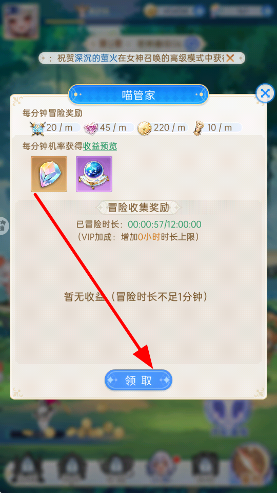 3、喵管家界面查看冒险时长与对应的物品奖励,当满足领取条件时,点击领取,获取相应的冒险奖励收益。