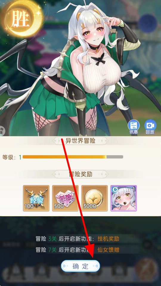 2、战斗胜利后,会弹出胜利结算界面,此时点击确定,领取冒险奖励,这些奖励包含经验、道具等,能助力成长。