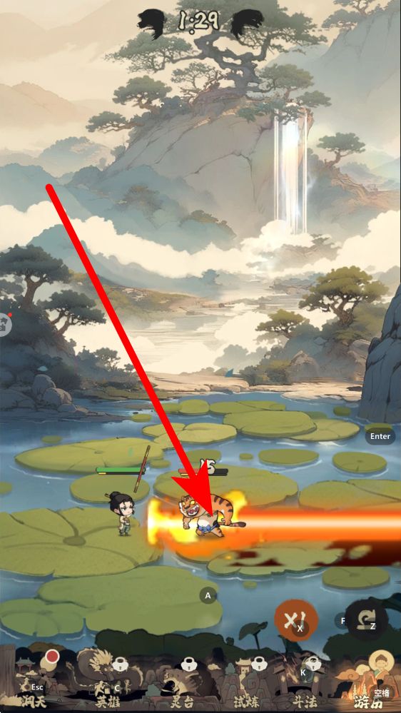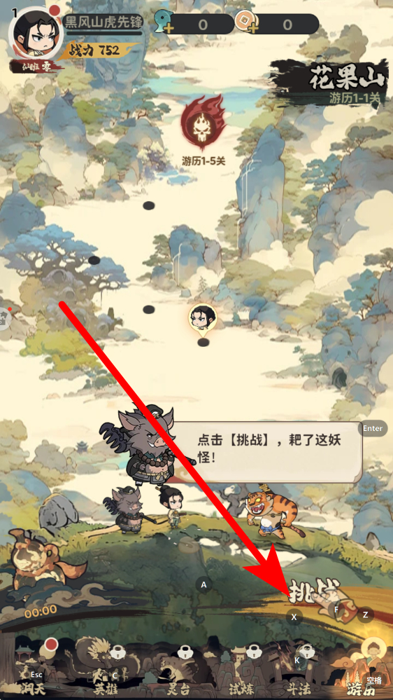 2、准备挑战妖怪触发在花果山游历场景画面,跟随指引点击挑战按钮,触发与虎妖等妖怪的对决,推动游历关卡如1到1关进度。