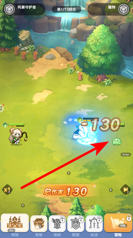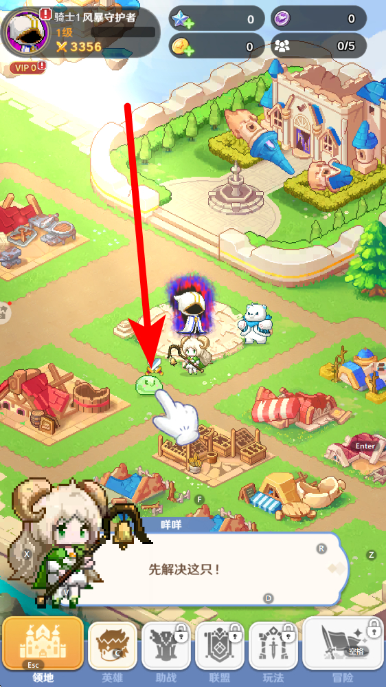 2、领地引导进入领地界面后,跟随指引点击场景内史莱姆目标,触发战斗教学环节,熟悉角色交互与战斗触发方式,完成引导可获取初期资源与成长提示。