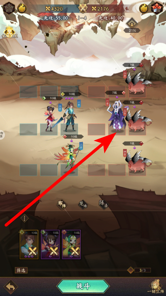 3、战斗布阵进入战斗前,新手可以在布阵界面调整神仙站位,根据敌方阵容,合理安排角色位置,利用先攻等机制,点击战斗开启对决,赢取胜利。