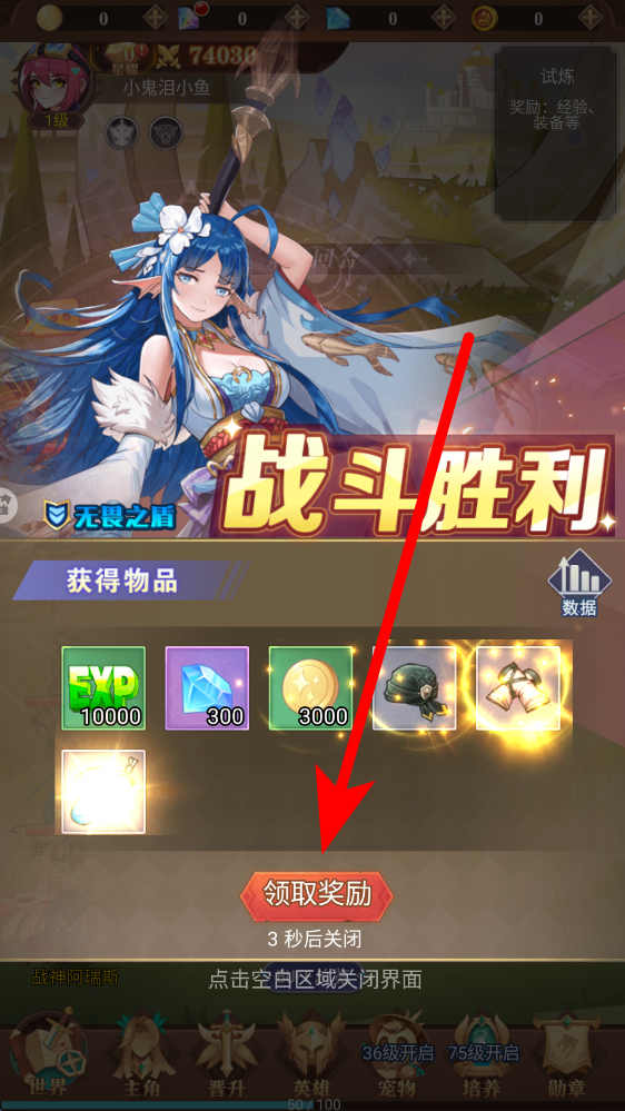 4、最后赢得胜利领取奖励,成功击败敌人后,点击领取奖励,可获得经验金币装备等奖励,助力角色成长,为后续冒险提供支持。