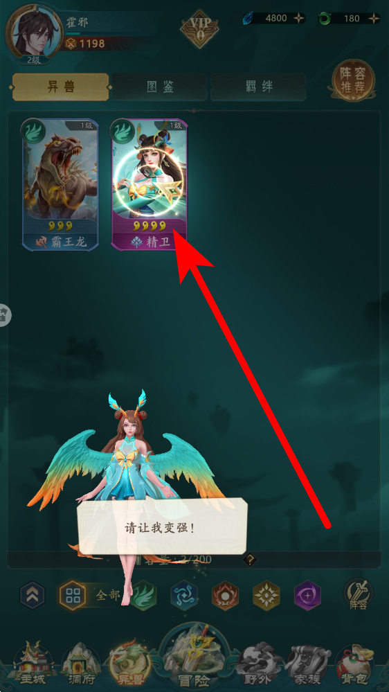 1、异兽界面中,4星精卫比3星霸王龙星级更高,等级上限与属性成长更优,优先选定培养,同时结合阵营职业,构建攻防协同的阵容体系。