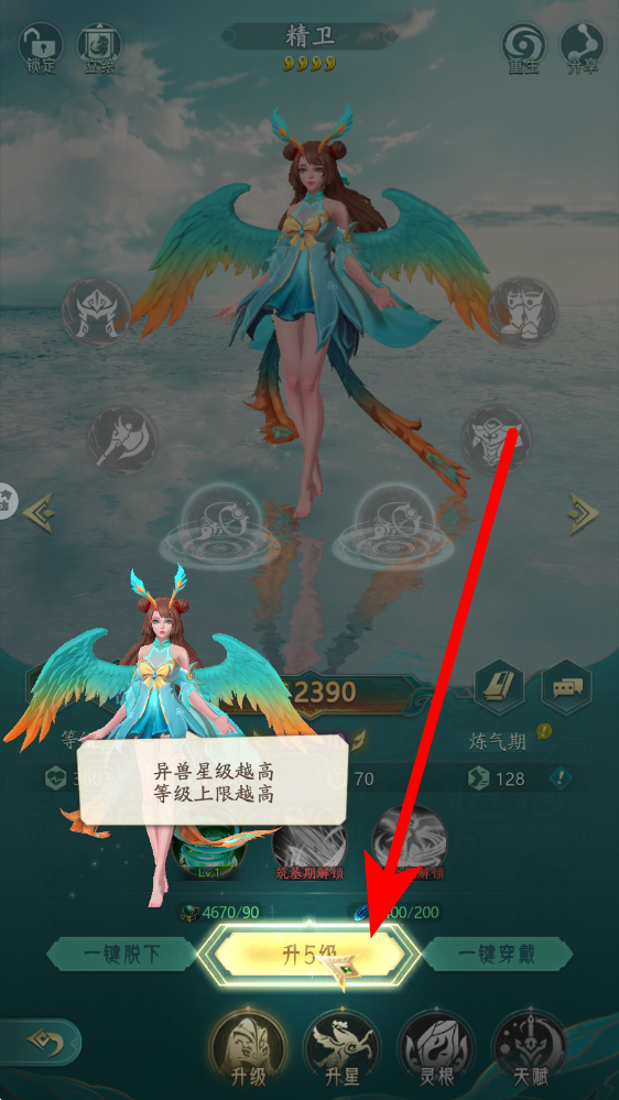 2、进入目标异兽页精卫,点击升级按钮消耗资源提等级,星级限制等级上限,收集碎片完成升星,解锁更高等级空间,持续强化战力。