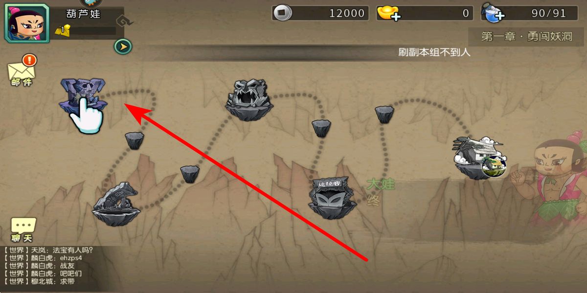 1、副本推进规划进入第一章勇闯妖洞界面,优先选择系统推荐副本,跟随指引点击解锁关卡,参与战斗积累经验与资源,为葫芦娃养成奠定基础。