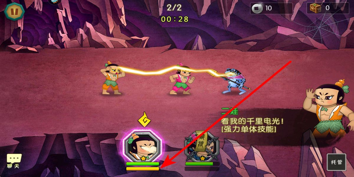 3、技能时机把握观察战斗界面葫芦娃技能槽,如二娃释放千里电光等单体技能时,选准时机点击对应头像,精准打击敌方关键目标,扩大优势。