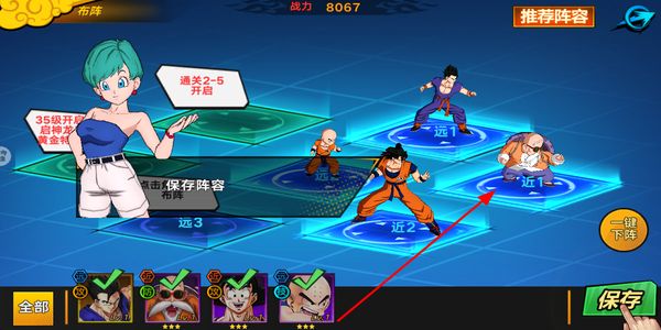 2、在布阵界面选择角色,将其布置到对应站位,调整阵容后点击保存,确定出战的战斗配置。