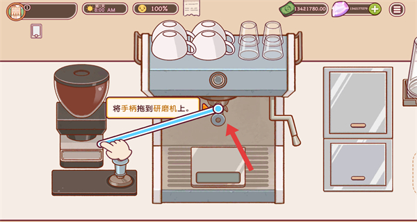 1、制作咖啡时,将手柄拖到研磨机上,启动咖啡豆研磨流程,为萃取浓缩咖啡做准备。
