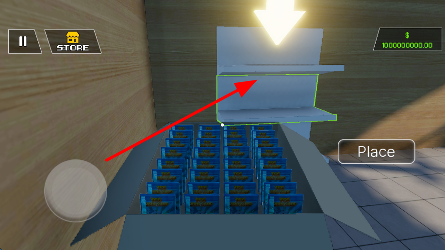 3、进入商店内部,找到空的货架区域,点击货架,再点击Place按钮,就能把之前拾取的卡牌整齐摆放在货架上,方便顾客选购。
