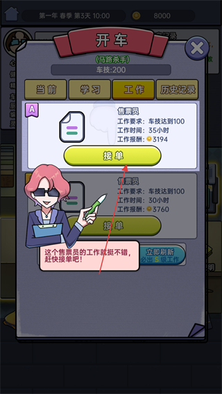 2、车技达到要求后,在工作界面选择售票员等工作接单,获取工资。