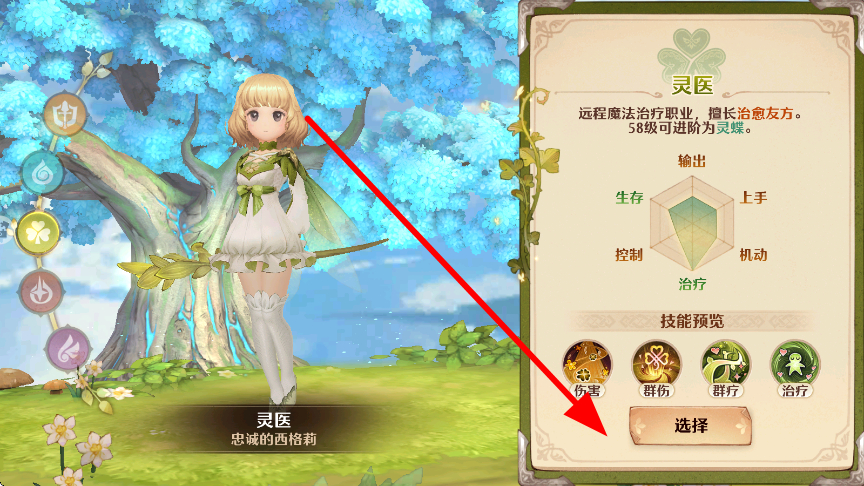 3、挑选选择不同职业,像灵医这类远程魔法治疗职业,擅长治愈友方,56级可进阶,选择好职业后,可运用相应技能开展冒险。
