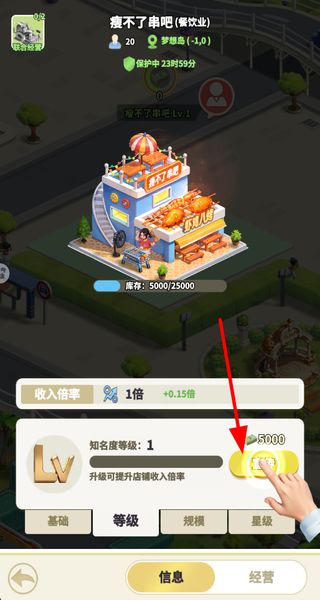3、进入已建成的店铺界面,消耗金币点击升级,提升店铺知名度等级,等级提升后店铺的收入倍率会增加,收益随之变高。