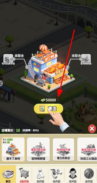 2、买地后选择店铺类型,消耗钞票点击建造按钮,就能在地块上搭建对应的店铺,搭建完成后店铺会开始运营,产生收益。