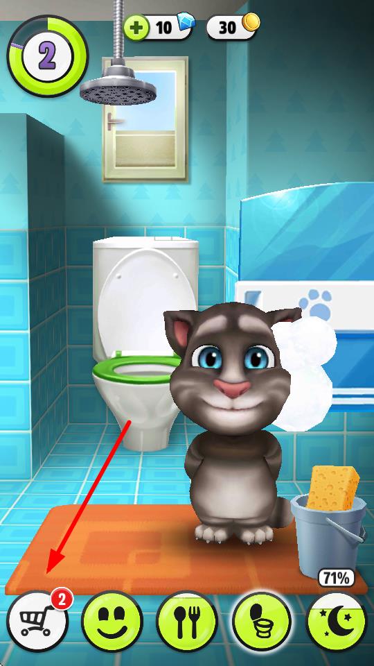 1、打开我的汤姆猫游戏,进入主界面,能看到可爱的汤姆猫,在屏幕左下角,点击带有购物车标识的按钮,进入相关界面。