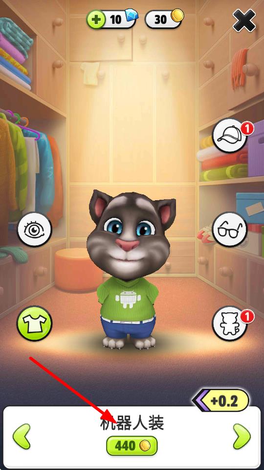 3、进入衣柜界面后,能看到各种衣物选项,下方会显示衣服的名称以及购买所需的金币数量,点击想要更换的衣服,确认购买或选择已拥有的衣服,就能为汤姆猫换上新衣服啦。