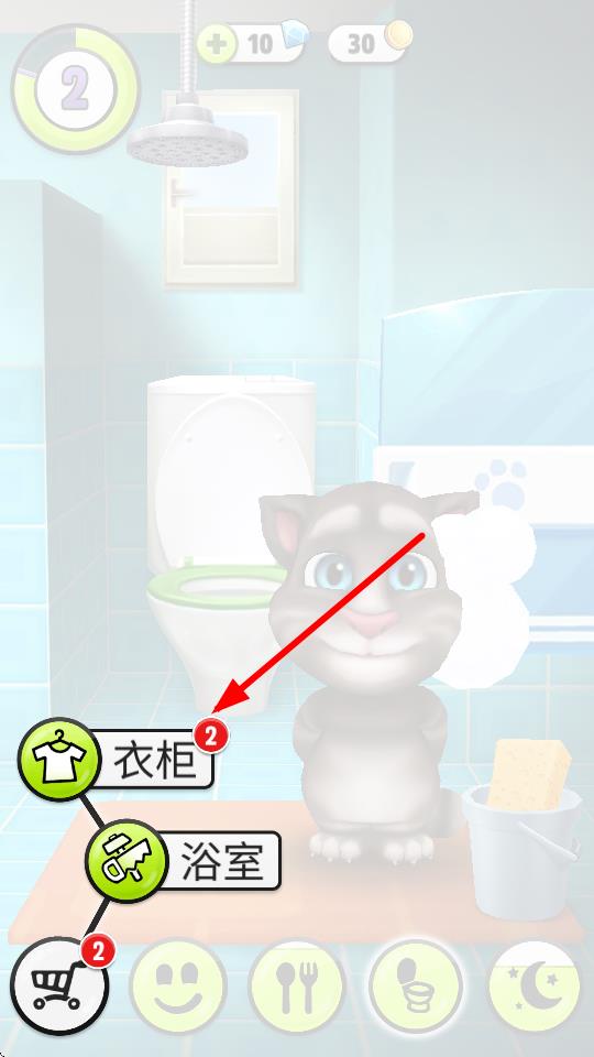 2、点击后,会出现几个功能选项,点击写着衣柜的按钮,进入衣柜界面,在这个界面,你可以管理汤姆猫的衣物,以及前往浴室等其他场景。