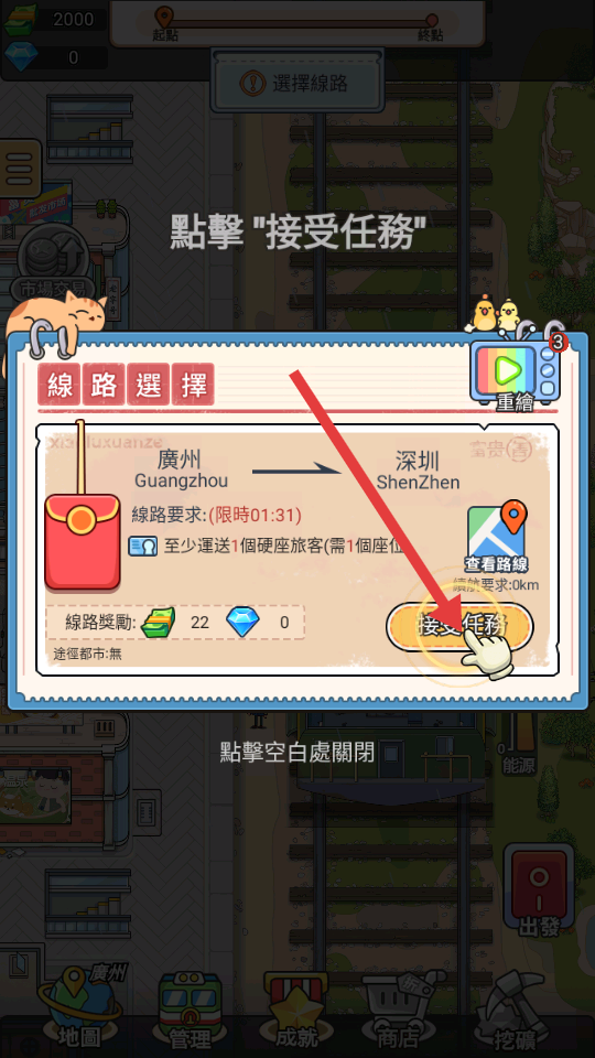 1、在路线选择界面,点击接受任务,接取从广州到深圳的运输任务,需在限时内运送至少1个硬座旅客。