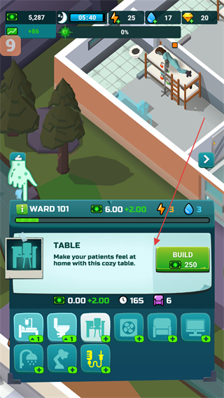 2、进入WARD101区域,点击TABLE对应的BUILD按钮花费250资源建造桌子。