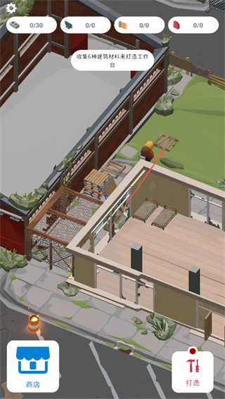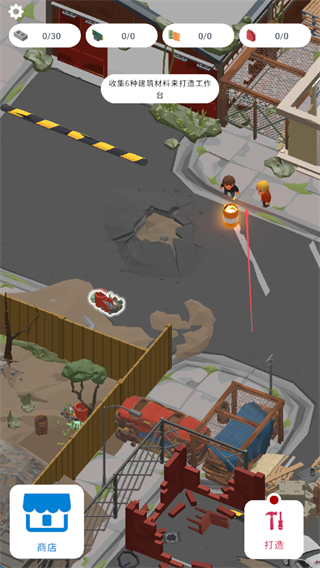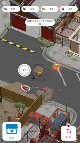 2、根据提示,收集6种建筑材料来打造工作台,采集不同区域的资源如车辆、建筑废墟等,获取所需材料。